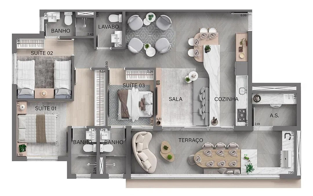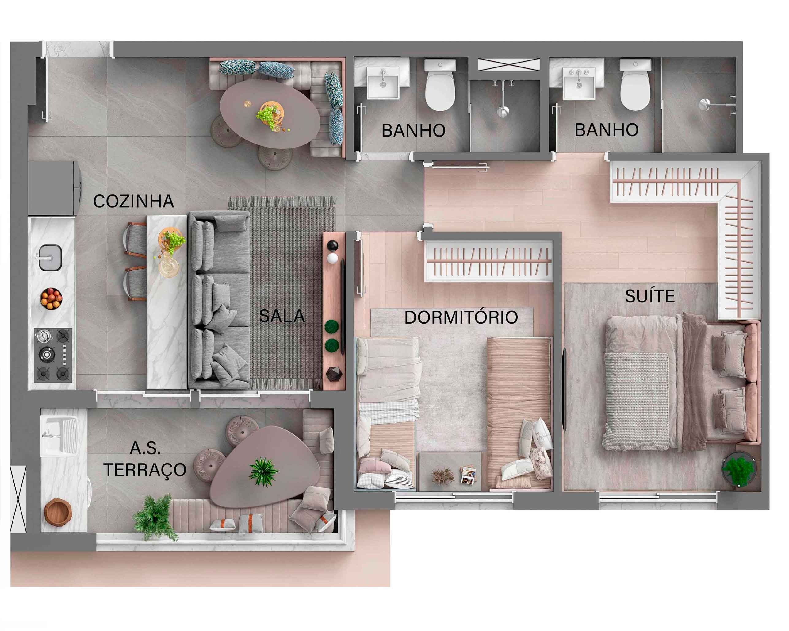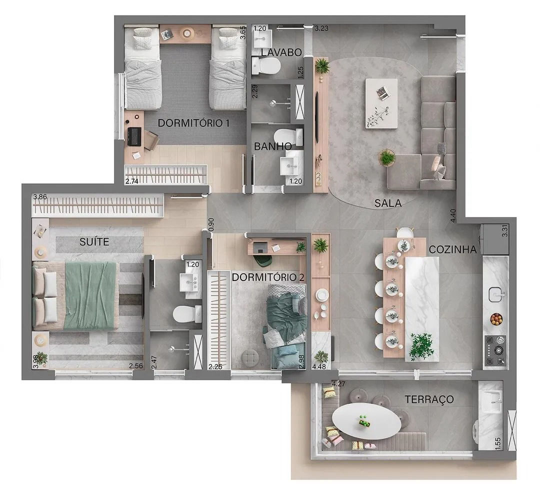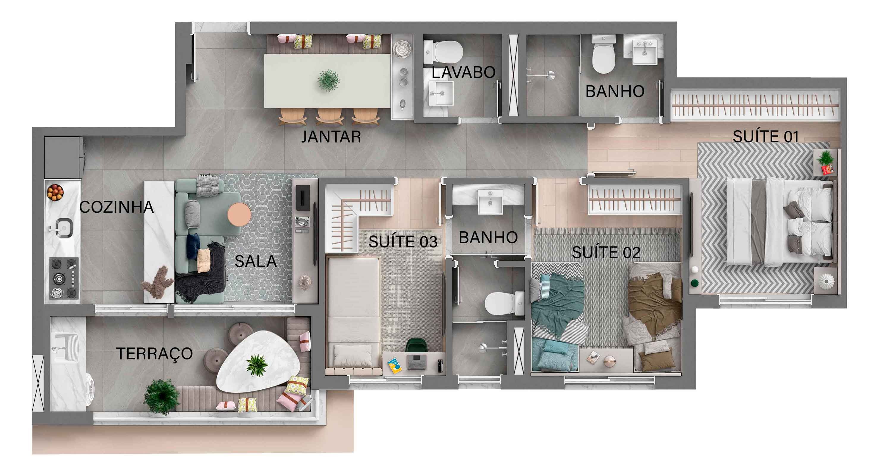 Apto de 74m² com Living Ampliado - Perspectiva ilustrada